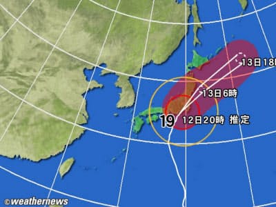 台風19号は12日午後5時現在、静岡県下田市の西南西約60キロを時速35キロで北北東に進み、中心気圧は945ヘクトパスカル、中心付近の最大風速は45メートル。
