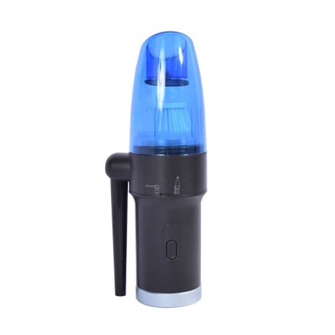 車のドリンクホルダーに入るコンパクトなサイズの、クリーナー兼エアダスター。先端ノズル側では吸引を行ない、真ん中部分のノズルからは風を噴射する。強さは、強/弱の2段階で切り替え可能。車内を清掃するときや、洗車後に細かい部分の水を吹き飛ばすときに使用できるという。車内以外でも、キーボードや隙間のホコリが気になるときにも活用できる。