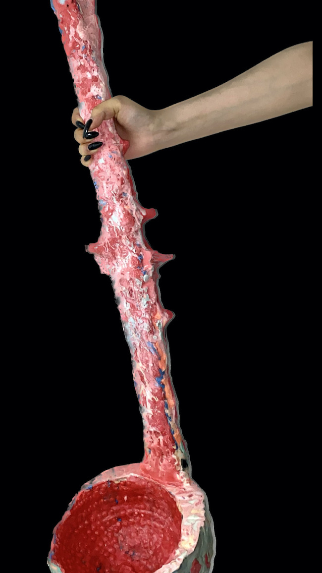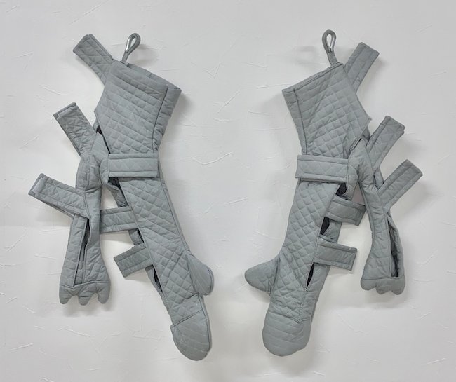 今回はペインティングや彫刻といった形式を超えた作品群、人型の装置と人とは異なる生物適応の形態を持つウニに似た五放射相称形の立体のほか、生物において原始的な感覚とされる嗅覚に着目した作品、可愛らしいミトンに至るまで、様々なオブジェクトが組み合わされ、互いにインターテクスト性を帯びた、3フロア全体によるインスタレーションが生み出された。